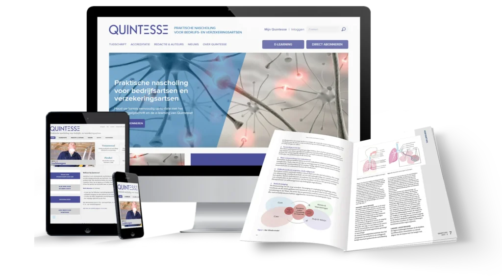 Quintesse is hét geaccrediteerde nascholingsplatform voor bedrijfs- en verzekeringsartsen. Het platform biedt actuele, betrouwbare nascholing die je ondersteunt bij complexe vraagstukken binnen arbeid, gezondheid en sociale zekerheid.